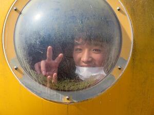 雨の朝、カッパを着て自力登校です。小学生も傘をさして、元気にあいさつです。