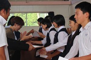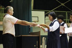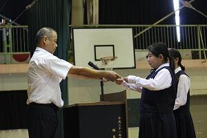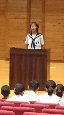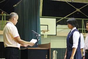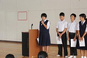 体育大会も終わり4月から半年が過ぎ、1学期の終業式が行われました。生徒代表4名が発表しました。そして、山之口校長が1学期を振り返って、生活面及び学習面の話がありました。また、終了後、各表彰が行われました。