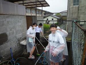 2年生が最初のプール清掃をしました。ちょっと、小雨でしたが元気に掃除をしました。プールの底に溜まった木の葉や火山灰等をブラシなどで片付けていきました。この後、1・3年生が仕上げをしていきます。もうすぐ、水泳の授業が始まります。