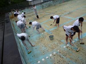 プール清掃の仕上げを学年別にしました。火山灰は、なかなか流れず苦労しました。プールサイドやシャワーなど掃除をして、終了です。来週あたりから水泳が始まります。