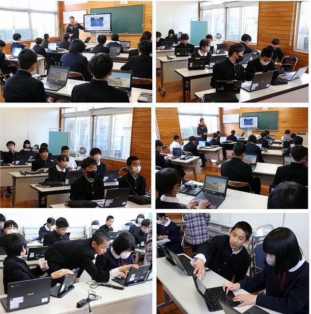 生徒たちは、新しいタブレット端末を手にすると目を輝かせ、実際に操作しながら意欲的に取り組んでいました。分からないところを友達同士で教え合う姿も見られ、主体的に学び合う有意義な時間となりました。