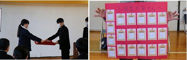 1・2年生のみなさんが、これから高校入試に挑む3年生に向けて、激励のメッセージを書いて渡しました。