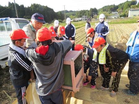 千歯扱きや唐箕を使って昔の脱穀のやり方を体験しました。