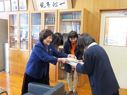 本日、小林地区更生保護女性会より3名来校され、卒業を前にした3年生に対して、「読書の際に、また日記帳等に使っていただければ幸いです」と押し花の「しおり」がプレゼントされました。一度きりの人生を出会った方々や故郷を大切に思い、これからも健康に気を付けて、立派に成人されますようにとお言葉をいただきました。