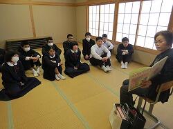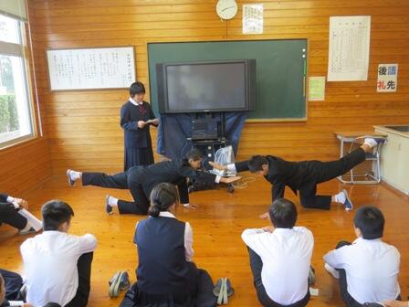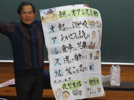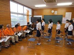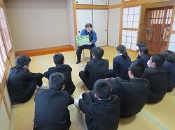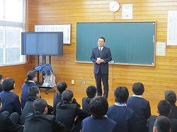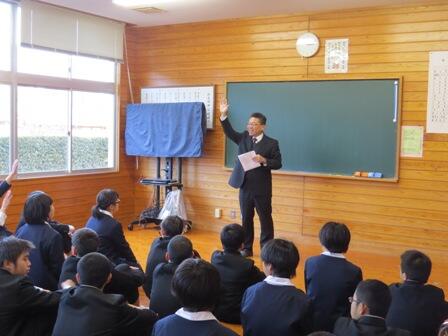 その後、永久津小学校校長先生をお招きして、「のみの話」と題しての講話を受けました。まず「のみ」は上に20㎝、横に41㎝しか飛べないが、10㎝ほどのコップの中に「のみ」を入れ、ガラスふたをすると、いつの間にか「のみ」は、10㎝以上飛べなくなるという実験の説明からでした。これを、どのようにすれば元のように飛べるようになるのか!ということを、人間世界に置き換えて「あきらめ」をいかに無限の可能性を信じて、自分の幸せを見つけていくのか。そして、そのために生きていくことの大切さをお話しされ、学級生全員うなずきながら、大いに感銘を受けました。
