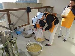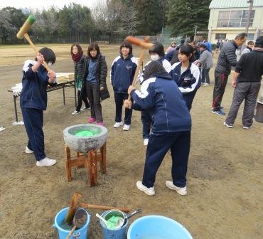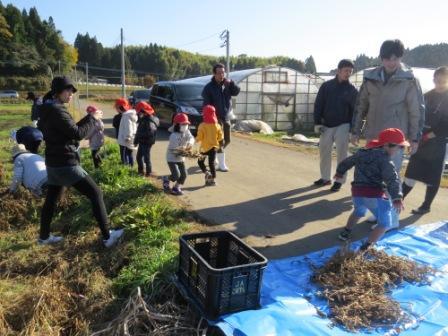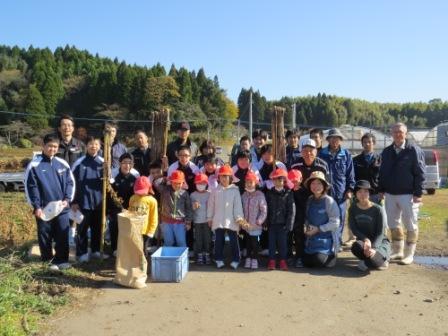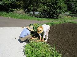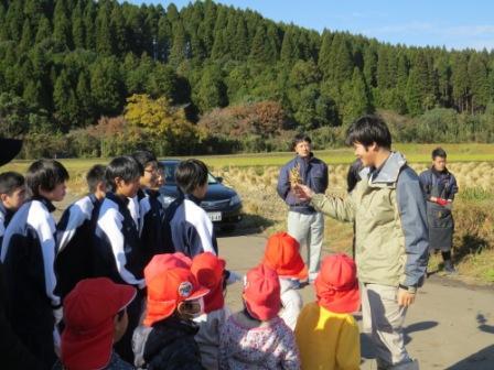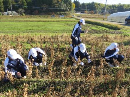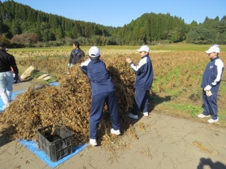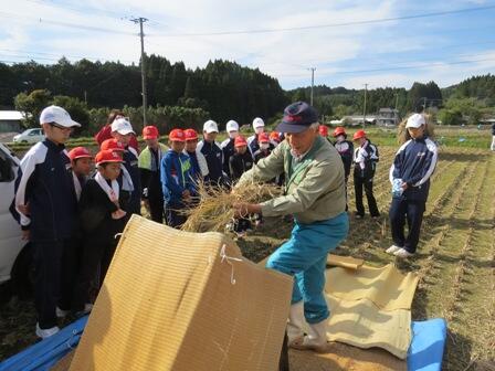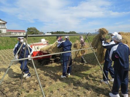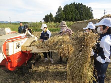 本日の午後、中学1年生と小学5年生で脱穀を行いました。