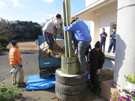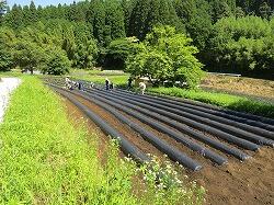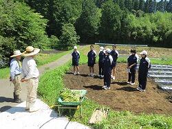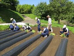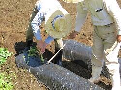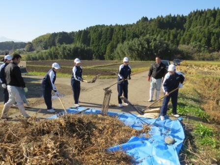 6月1日(金)9時40分~10時30分、2年生8名の技術の授業において、栽培学習の一環として、芋植えをしました。地域コーディネーターの神之薗 司氏と今別府 猛氏による指導の下、宮崎紅と紅はるかの2品種を垂直と斜めの2通りで植えつけました。今年度も1人1列で責任をもって管理します。土日月が晴天に恵まれそうでしたので、2日(土)早朝に水かけを行いました。さて、これからの成長を2年生が見守り、手入れを行っていきます。10月の収穫に向けてこれからの管理が大切です。(今年度は、畑の場所を変えました。)
