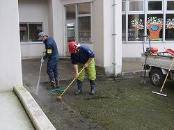 今回、須木の平野建設様がご厚意により、高圧洗浄機を用いて、校内のセメントやタイルなどきれいにしていただきました。奉仕作業が終了後も引き続き、作業をしていただきました。雨等で滑りやすくなっていた場所の危険性がなくなりました。誠にありがとうございました。感謝申し上げます。