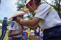 岡原地区に古くから伝わるめしげ踊りを、小学校4年生~中学3年生までの児童生徒全員で披露しました。中学生が、小学生に衣装の着付けを手伝う姿は、ほほえましい光景です。