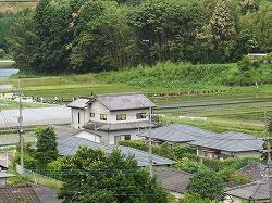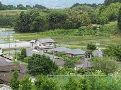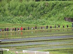 本日13時30分永久津中学校を出発した29名の生徒と6名の先生方による田植えシーンを高台にある学校より撮影しました。小学生5・6年生とともに横一列に並んでいるところです。詳細は、現場に行かれた先生方の写真を今後アップします。良き天気に恵まれました。