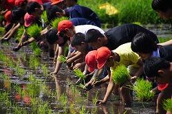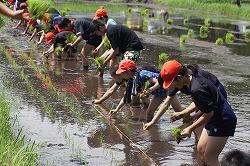 小学5・6年生と中学生全員が稲作体験学習(田植え)を通して、食の意義と大切さを学び、共同作業を通しての責任ある行動や自主的、自治的な行動を経験しました。13時30分に永久津中を出発して、目的地まで歩いていき、田植え終了後、15時30分現地解散しました。12月の収穫祭が楽しみです。地域コーディネーターやJA、営農組合の方々にお礼申し上げます。