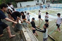 あいにくの雨の中での活動になりましたが、全校生徒でプール清掃を行いました。プールの横に竹林があり、竹の葉がプールの底に沈殿していて大変でしたが、全員で協力し、きれいにしました。生徒たちは水泳の授業を楽しみにしているようです。