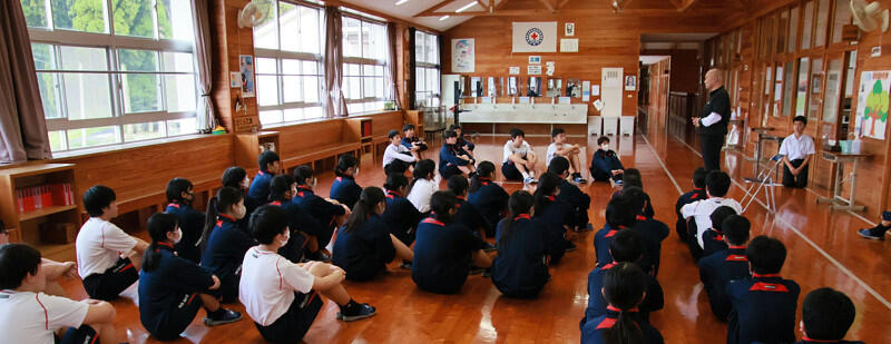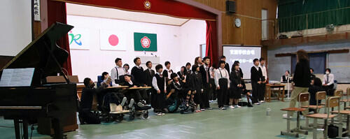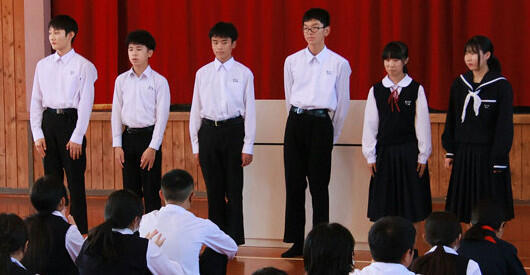 次に、東方中全校生徒による「翼をください」「地球星歌」の演奏が披露されました。男女のハーモニーが美しく体育館に響き渡りました。