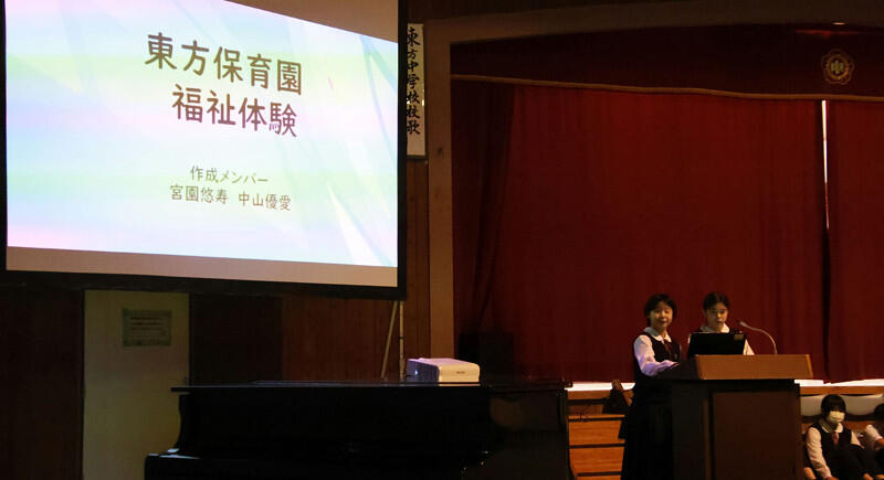 1年生は、「福祉体験学習のまとめ」を行いました。保育体験や高齢者疑似体験、車いす体験などを通して学んだことを、分かりやすく発表しました。