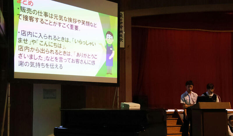 2年生は、「私たちの暮らしを支える仕事」をテーマに、7月3日・4日の2日間にわたって実施した職場体験学習で学んだことを発表しました。