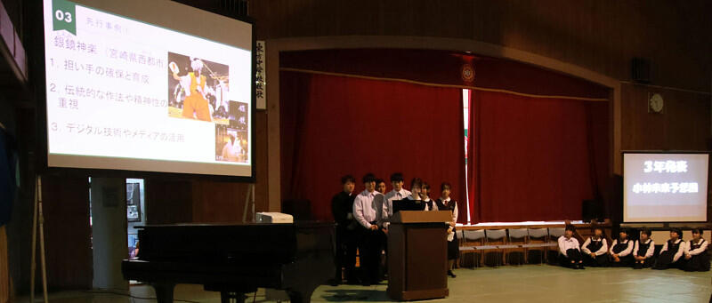 3年生は、「小林市未来予想図」をテーマに、畜産農家の方へのインタビューや、伝統芸能の継承について自分たちで考え、まとめた内容を発表しました。
