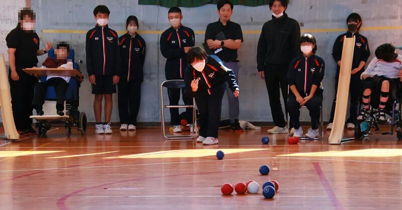 ボッチャでは、白いジャックボールを狙って赤と青のカラーボールを投げますが、力加減が難しいようでした。
