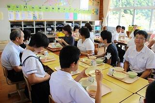 11月1日(水)、本校の3年生達と都城きりしま支援学校小林校の卒業生の方々、支援学校中等部の生徒達と一緒に全校で交流給食を行いました。