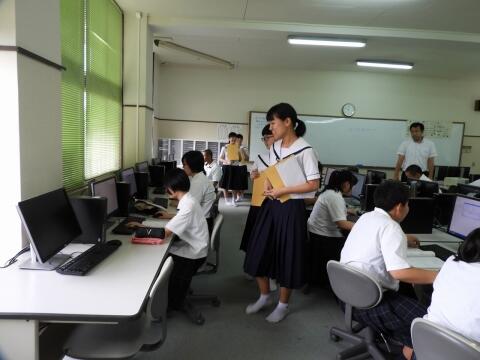 5月15日(水)、1年生の技術の授業の様子を紹介します。本校は、ICTの先進校として、各教科でICT機器を使用した授業を展開します。本校にはタブレットが22台、コンピュータ室にはディスクトップ型コンピュータ20台があります。今日は、技術の授業で1年生が1枚の写真から背景を切り抜き、自分の姿だけを取り出す画像処理を行っていました。初めての経験でしたが、小学校からの積み重ねで、上手に画像処理を行うことができていました。本校では、このようにそれぞれの教科でリテラシーを高めています。