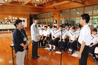 5月22日(火)に本校の体育館にて、東方小学校・都城きりしま支援学校小林校中学部・東方中学校の3校で、「ひむか天語り」の鑑賞教室が行われました。美しい古事記の絵を背景にして、女優の柴田美保子さんが古事記の世界を語って聞かせてくださいました。生徒たちは古事記の神話の世界に浸り熱心に鑑賞していました。