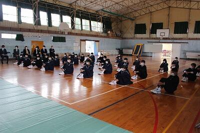 2月29日(土)、来週から3月15日(日)まで2週間の臨時休業に入ります。校長先生の話のあと、家での過ごし方についてと学習のことについて担当から話がありました。そして、3年生から先生方に「お世話になりました。」とメッセージの色紙が渡されました。生徒全員が揃うのは今日が最後の日です。集会の後、みんなで写真を撮りました。思い出の一枚となりそうです。
