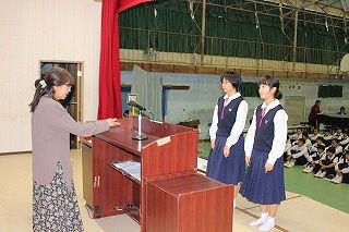 10月5日(金)で長かった1学期が終了しました。終業式では各学年の代表生徒と生徒会の代表生徒が1学期の学習面や生活面の反省を述べてくれました。また、校長先生からは、「みんな1学期は一生懸命頑張ったね。」という激励の言葉がありました。(詳しくは校長トーク第17回を見てください。) 最後に、たくさんの生徒が表彰されました。生徒の皆さん、1学期お疲れ様でした。また2学期頑張りましょう。