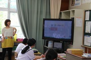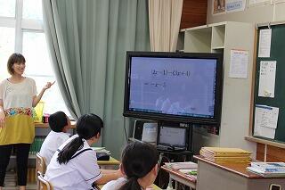 1年は数学の授業で、電子黒板とデジタル教科書を使って、前の時間に学習した文字式の計算練習をクイズ形式で行いました。