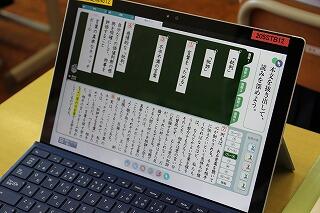 3年は国語の授業で、電子黒板とデジタル教科書、授業支援ソフト、タブレットPCを使いました。生徒は電子黒板のデジタル教科書から流れる説明文の音声を聞きながら、同時にタブレットPCに表示される説明文の文章を見て、批評と批判のちがいについて書かれた文章を指でドラッグしながら振り分けていました。教師は、教師用タブレットPCと生徒用タブレットPCにインストールされている授業支援ソフトを活用して、各生徒の周りを回りながら、教師用タブレットPCに表示される全生徒のタブレットPC画面を見て、支援が必要な生徒を把握してアドバイスを行っていました。