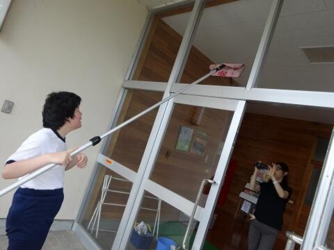 6月18日(火)、今日の午後、中学部の2年生2人が作業学習の時間に、中学校の玄関の窓をピッカピカに磨いてくれました。職員室に来て、「ガラスを磨きに来ました。磨いて欲しいところはありますか?」。その気持ちだけで有難かったのですが、西側の玄関が汚れていたので少しでもきれいになればとお願いしました。ところが、何と本格的に道具を使い、水で流しピッカピカにしてくれました。終わって見に行くと、ガラスがあるのか分からないくらい透き通っていて本当にびっくりしました。※中学部の許可を得て画像を掲載します。