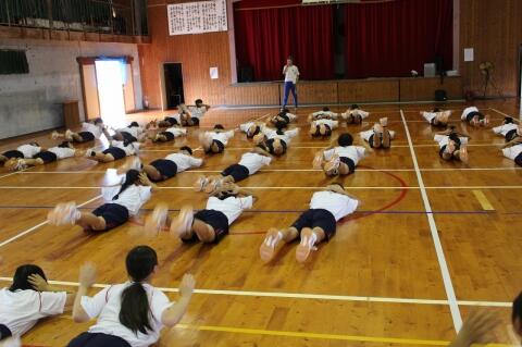 10月3日(木)、3・4校時の体育は全校体育。今日は、県の学校体育実技サポーター派遣事業の一環で、市内のBFORMATIONスタジオでダンスを指導されている先生をお招きしました。ダンスに関するお話から基礎的な動きを2時間みっちり指導していただきました。はじめは、恥ずかしがっていた生徒も、ダンスの楽しさに魅了され、次第に軽快に楽しく踊ることができました。あと3回来校されて指導していただきます。