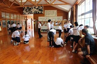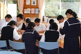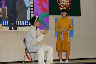 9月10日(月)に、9月23日(日)に行われる陰陽石まつりで輪太鼓を演舞するメンバーを決めました。また、生徒全員で輪太鼓の衣装のサイズを合わせたり、着付けの練習をしました。生徒同士でペアやグループをつくって、協力して着付けの練習をしました。