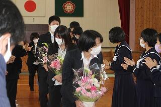 3月30日(火)に離任式が行われました。今年度本校では、4名の先生方が異動となりました。長い先生で本校10年、短い先生で本校1年の勤務でしたが、一生懸命本校の生徒や保護者のために尽くされました。別れはさみしいですが、新しい赴任地ではお体を大切にされて、頑張ってください。ありがとうございました。