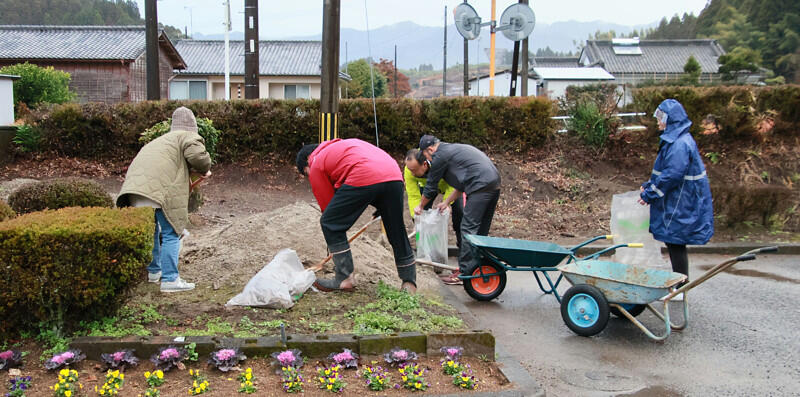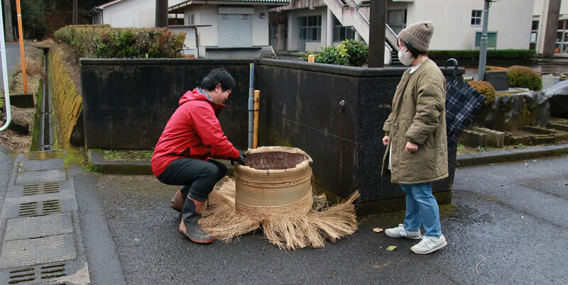 真竹を土嚢でしっかり固定した後、さらに上からシラスを入れます。