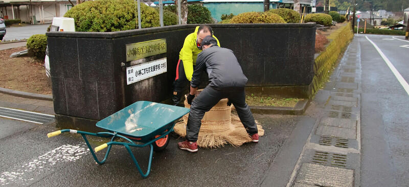まず、保管してあった、根巻き(土台)の部分を校門に運びます。