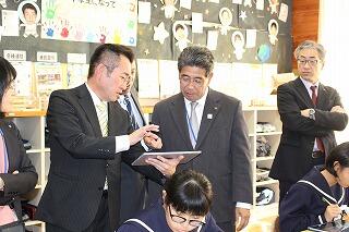 11月14日(水)に小林市長や教育委員会の方々がタブレットPCを使った授業の参観に来られました。授業は1年生の国語で、タブレットPCに入っている国語のデジタル教科書を使って、あらすじや主人公などの気持ちを図に表していきました。小林市長をはじめ参観された方々は、大変興味深く参観されていました。