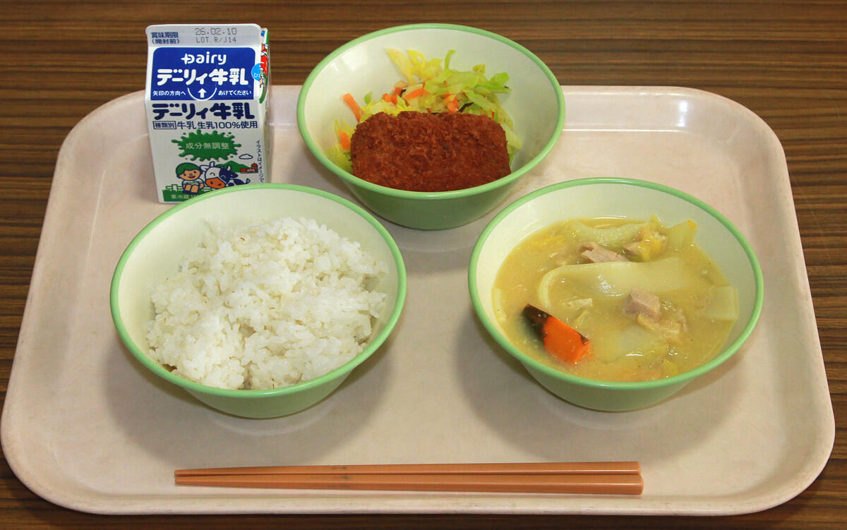 麦ご飯、ほうとう汁、メンチカツとキャベツの昆布和え