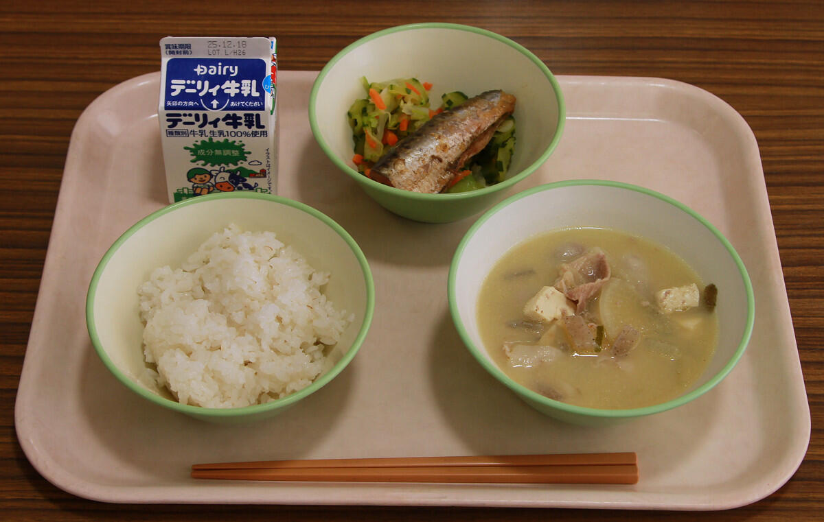 麦ご飯、豚汁、鰯みぞれ煮、生姜和え