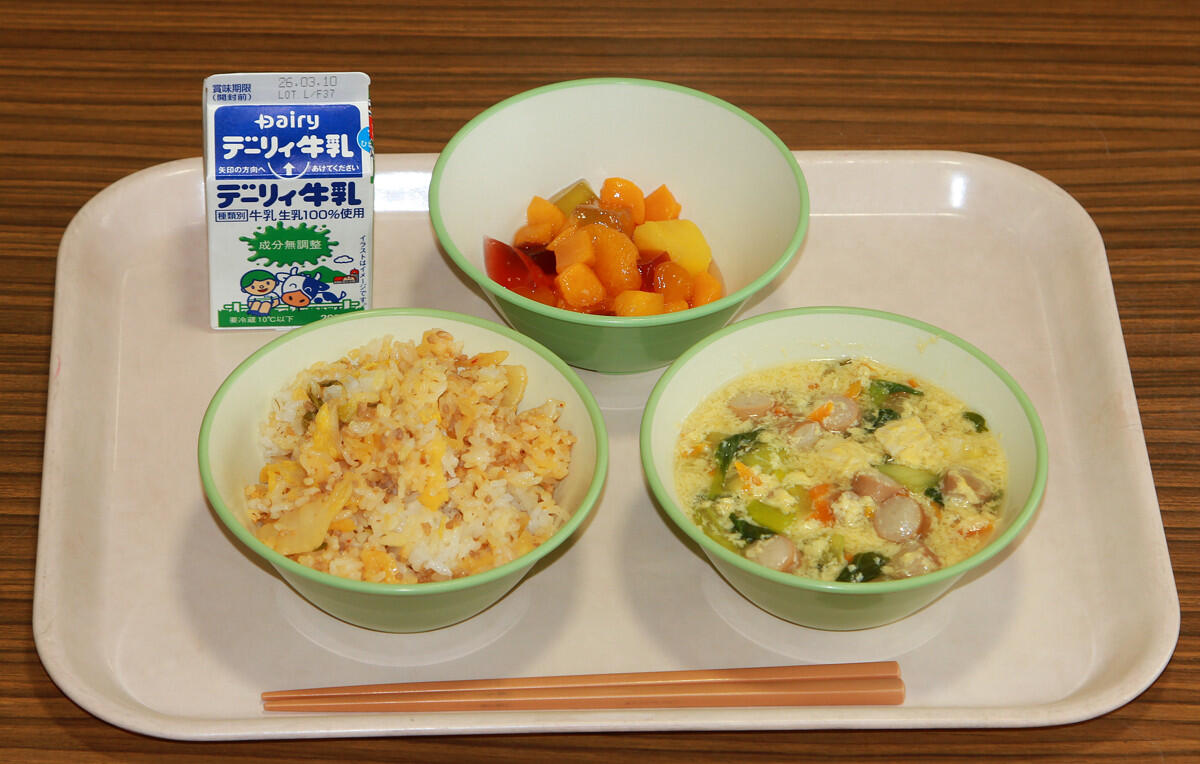 キムタクご飯、卵スープ、フルーツポンチ