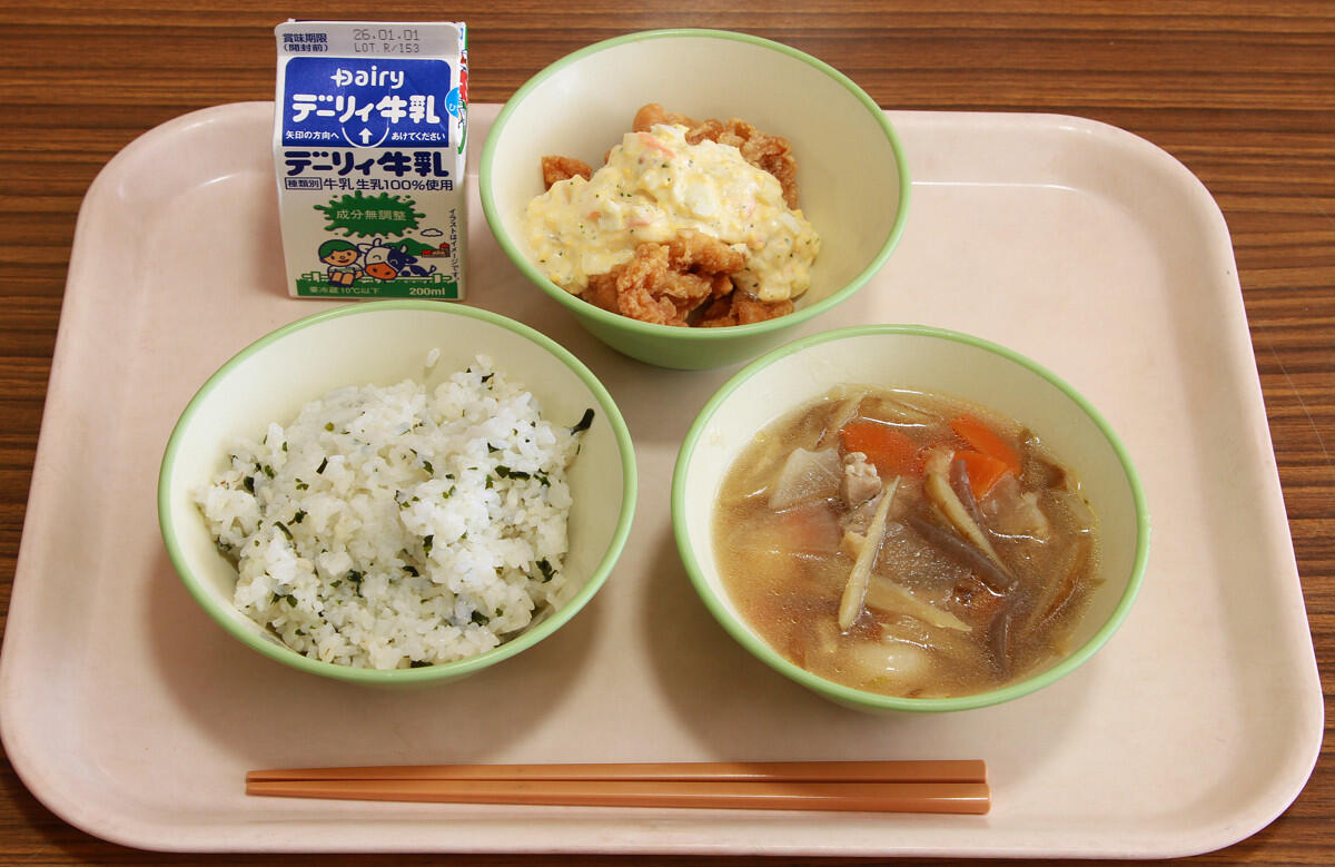 ワカメご飯、団子汁、チキン南蛮