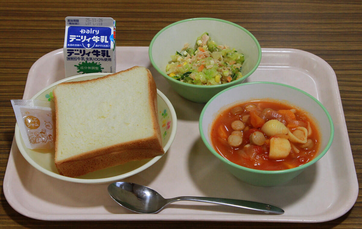 食パン、リンゴジャム、ミネストローネ、チーズサラダ