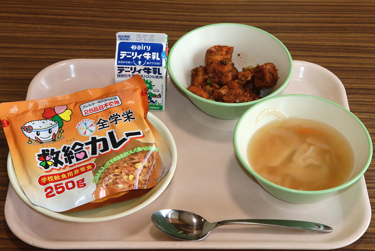 救給カレー、ギョーザスープ、タラのたこ焼きソース