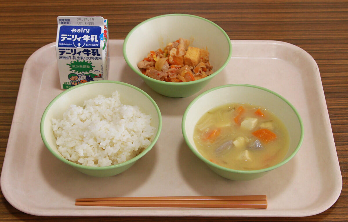 麦ご飯、京芋の味噌汁、豚肉と厚揚げのキムチ炒め