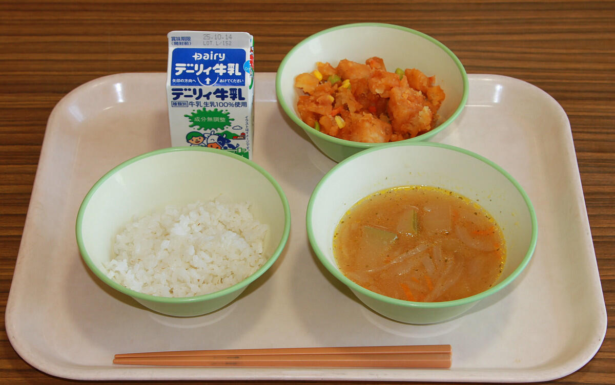 麦ご飯、冬瓜のスープ、魚のオーロラ和え