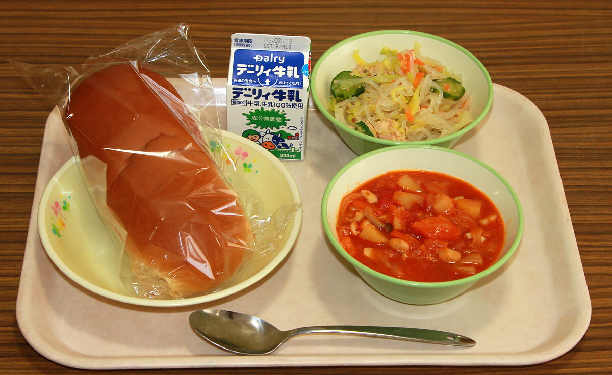 黒糖パン、鶏肉のトマト煮、マロニーサラダ