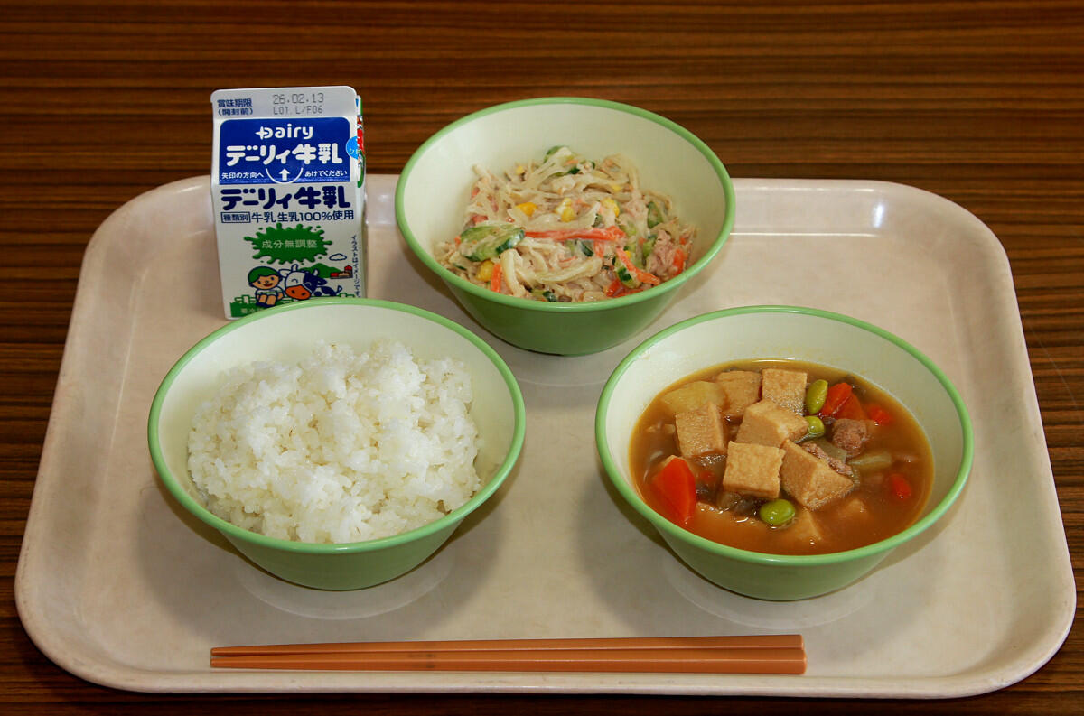 麦ご飯、鶏肉と厚揚げの中華煮、千切り大根のマヨネーズ和え