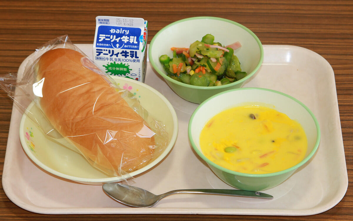 コッペパン、パンプキンポタージュ、アスパラサラダ