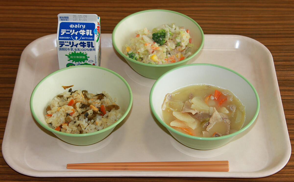 高菜ご飯、豚汁、ツナマヨサラダ