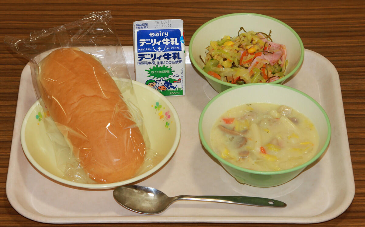 コッペパン、マカロニのクリーム煮、りっちゃんサラダ