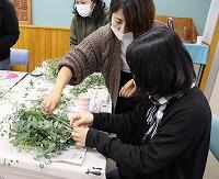 おもちゃ飾りのリースではなく、本物の木やつる、草花を使用して本格的なリースを、全員が初めて作りました。