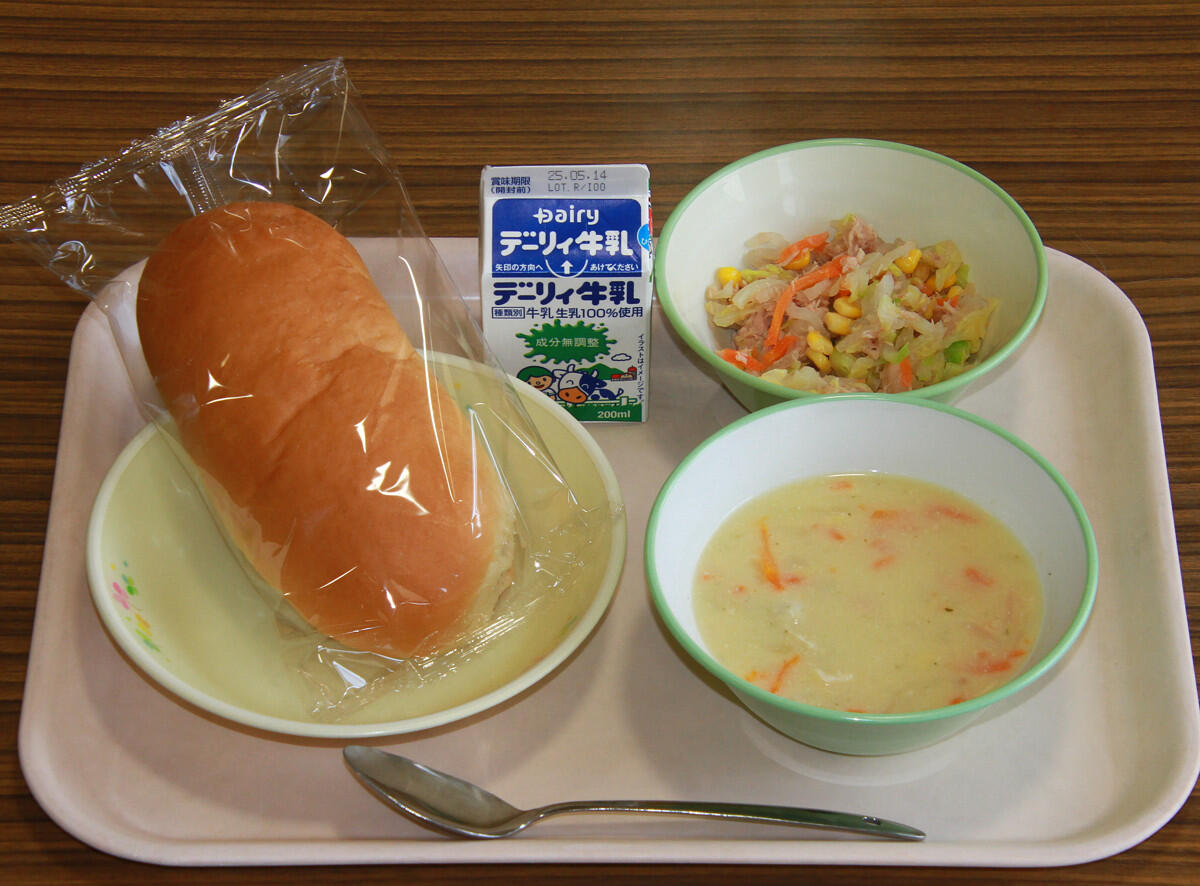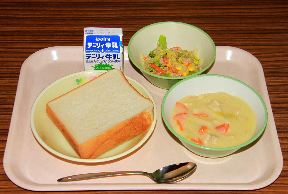食パン、マカロニのクリーム煮、野菜とコーンのサラダ